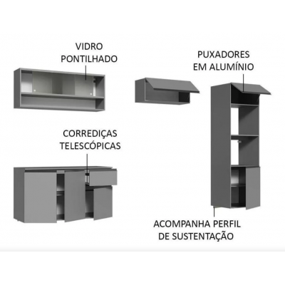Focused on durability, the furniture consists of high quality materials. It has aluminum handles in Titanium color, telescopic slides for full drawer opening, metal hinges on the doors and glass in the air dotted in the air.