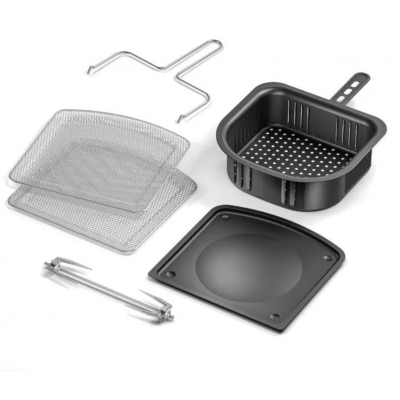 Included Accessories Kit: Two grids, collecting tray, spinning skewer, hook for handling and nonstick basket.